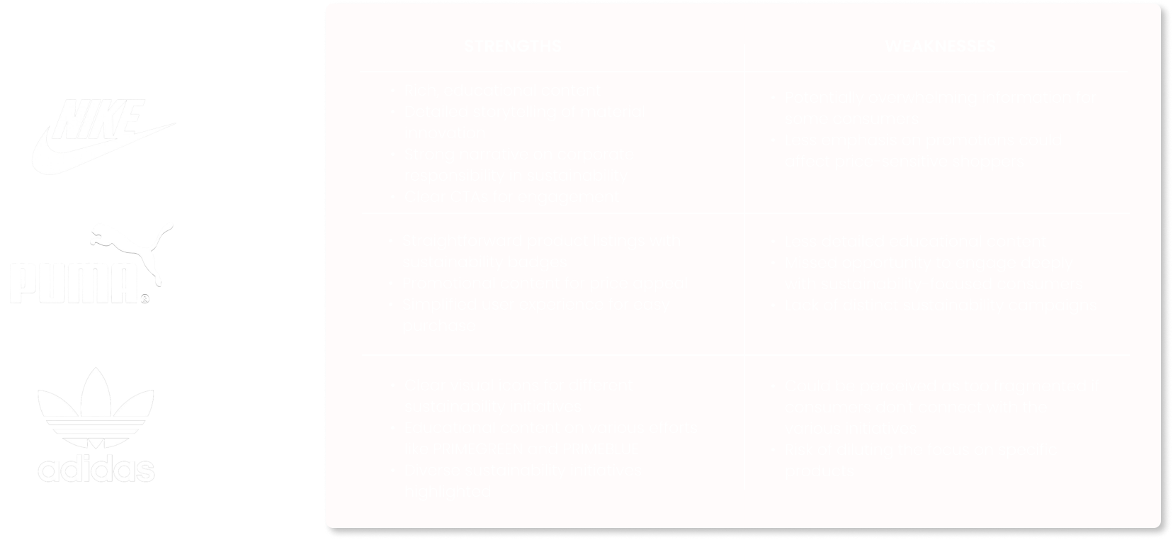 Leveraging a comprehensive competitive analysis of market leaders like Nike and Adidas, I gained valuable insights into their strategies for engaging similar target audiences. This research was crucial in shaping my approach to not only meet but exceed market standards and truly captivate our audience.