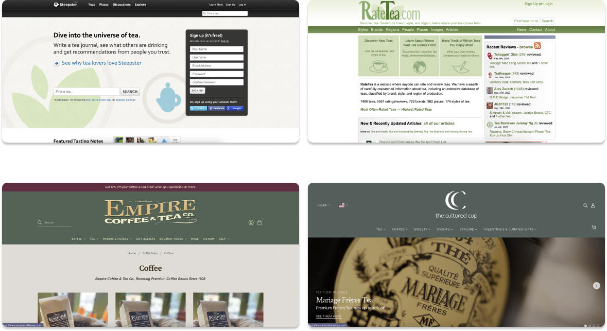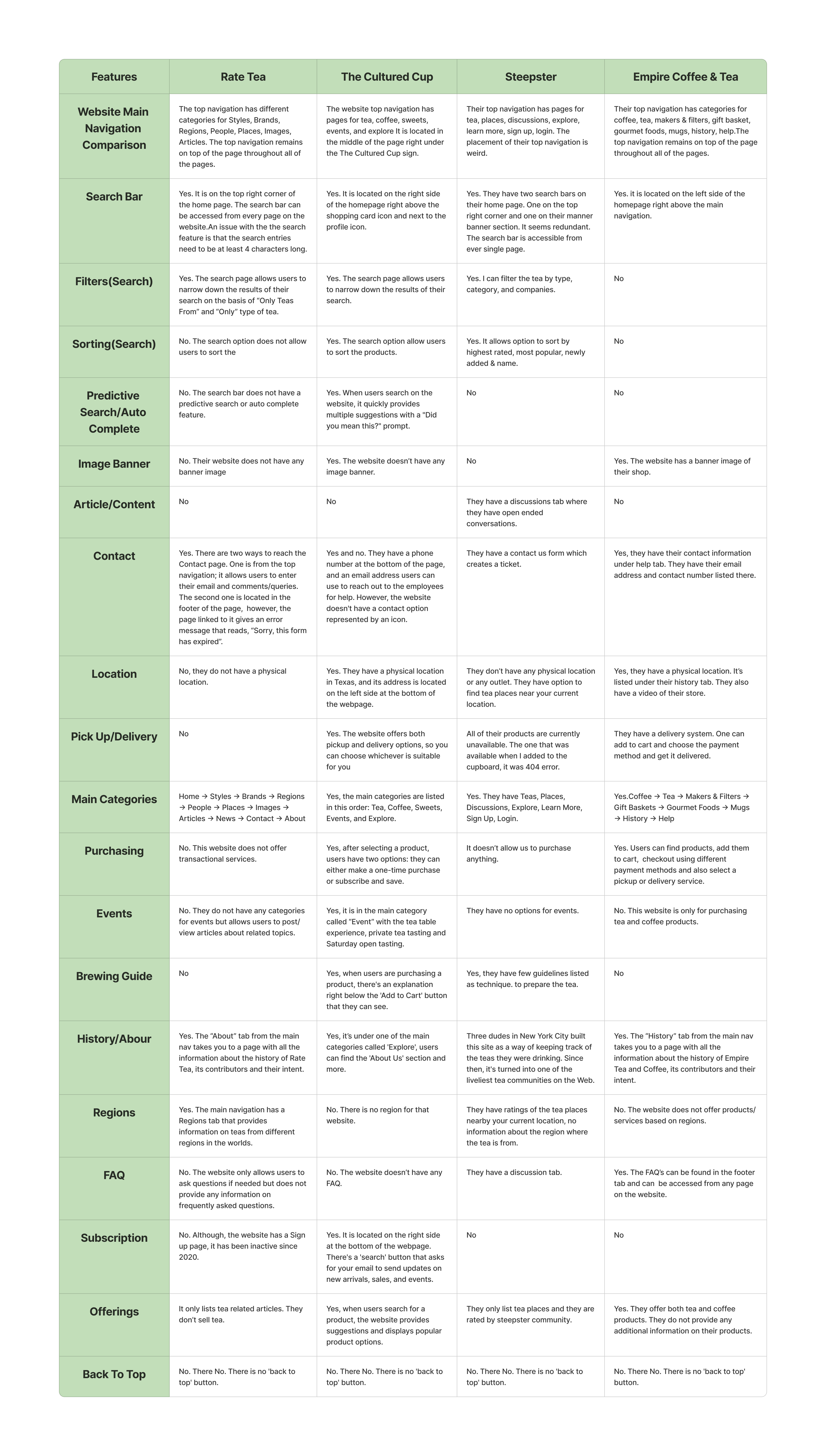 To initiate our project, we conducted a thorough scan of each selected tea and coffee website, documenting our observations. The results were systematically recorded into the table below, providing a structured overview for our competitive analysis.
